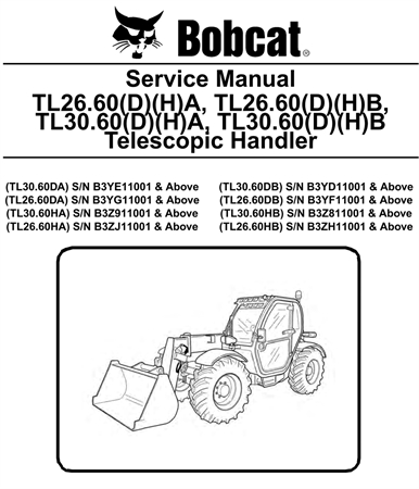 Bobcat TL26.60(D)(H)A, TL26.60(D)(H)B, TL30.60(D)(H)A, TL30.60(D)(H)B Telescopic Handler Service Repair Manual (TL30.60DA – S/N B3YE11001 & Above, TL26.60DA – S/N B3YG11001 & Above, TL30.60HA – S/N B3Z911001 & Above, TL26.60HA – S/N B3ZJ11001 & Above, TL30.60DB – S/N B3YD11001 & Above, TL26.60DB – S/N B3YF11001 & Above, TL30.60HB – S/N B3Z811001 & Above, TL26.60HB – S/N B3ZH11001 & Above)