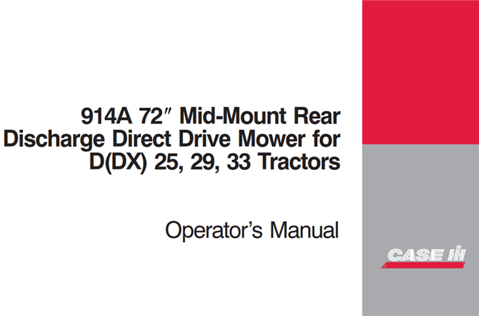 This manual offers full information you need for operate and maintain your Case IH 914A 72s Mid-Mount Rear Discharge Direct Drive Mower.