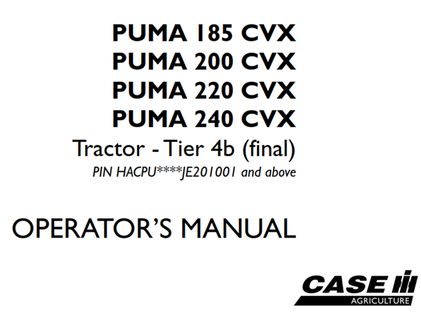 Original Factory Operator’s Manual for the Case IH PUMA 185 CVX, PUMA 200 CVX, PUMA 220 CVX, PUMA 240 CVX Tractor – Tier 4b (final).