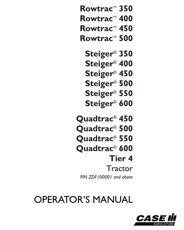 Original Factory Operator’s Manual for the Case IH Rowtrac 350, Rowtrac 400, Rowtrac 450, Rowtrac 500, Steiger 350, Steiger 400, Steiger 450, Steiger 500, Steiger 550, Steiger 600, Quadtrac 450, Quadtrac 500, Quadtrac 550, Quadtrac 600 Tier 4 Tractor.