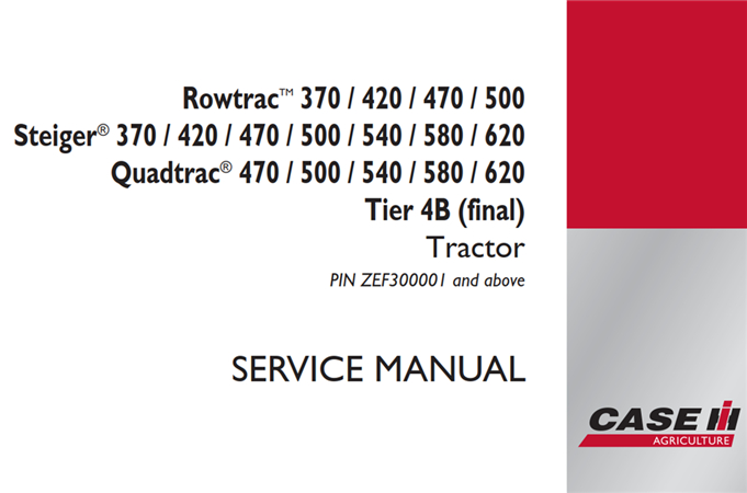 Original Factory Service Repair Manual for the Case IH Rowtrac 370/420/470/500, Steiger 370/420/470/500/540/580/620, Quadtrac 470/500/540/580/620 – Tier 4B (final) Tractors.