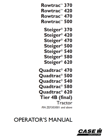 Original Factory Operator’s Manual for the Case IH Rowtrac 370, Rowtrac 420, Rowtrac 470, Rowtrac 500, Steiger 370, Steiger 420, Steiger 470, Steiger 500, Steiger 540, Steiger 580, Steiger 620, Quadtrac 470, Quadtrac 500, Quadtrac 540, Quadtrac 580, Quadtrac 620 Tier 4B (final) Tractor.