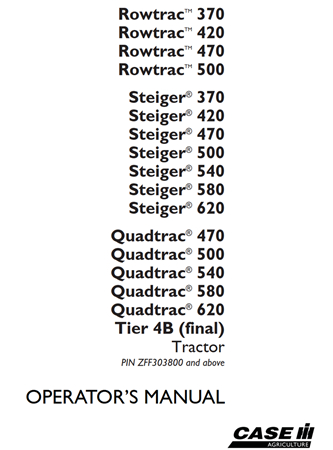Original Factory Operator’s Manual for the Case IH Rowtrac 370, Rowtrac 420, Rowtrac 470, Rowtrac 500, Steiger 370, Steiger 420, Steiger 470, Steiger 500, Steiger 540, Steiger 580, Steiger 620, Quadtrac 470, Quadtrac 500, Quadtrac 540, Quadtrac 580, Quadtrac 620 Tier 4B (final) Tractor.