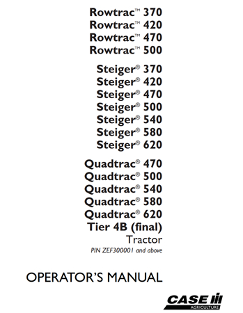 Case IH Rowtrac 370, Rowtrac 420, Rowtrac 470, Rowtrac 500, Steiger 370, Steiger 420, Steiger 470, Steiger 500, Steiger 540, Steiger 580, Steiger 620, Quadtrac 470, Quadtrac 500, Quadtrac 540, Quadtrac 580, Quadtrac 620 Tier 4B (final) Tractor Operator’s Manual (PIN ZEF300001 and above)