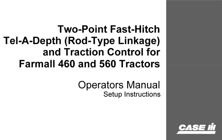 This manual offers full information you need for operate and maintain your Case IH Two-Point Fast-Hitch Tel-A-Depth (Rod-Type Linkage) and Traction Control.