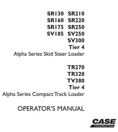 Original Factory Operator’s Manual for the Case SR130/SR210/SR160/SR220/SR175/SR250/SV185/SV250/SV300 Tier 4 Alpha Series Skid Steer Loader, TR270/TR320/TV380 Tier 4 Alpha Series Compact Track Loader.