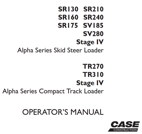 Original Factory Operator’s Manual for the Case SR130/SR210/SR160/SR240/SR175/SV185/SV280 Stage IV Alpha Series Skid Steer Loader, TR270/TR310 Stage IV Alpha Series Compact Track Loader.