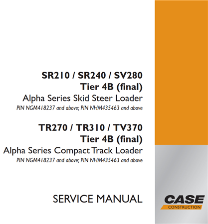 Original Factory Service Repair Manual for the Case SR210/SR240/SV280 Tier 4B (final) Alpha Series Skid Steer Loader, TR270/TR310/TV370 Tier 4B (final) Alpha Series Compact Track Loader.
