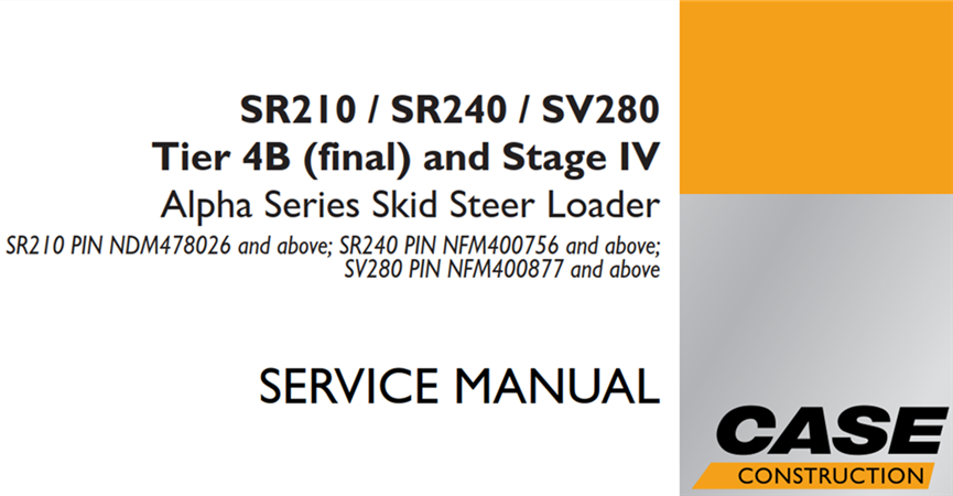 Original Factory Service Repair Manual for the Case SR210/SR240/SV280 Tier 4B (final) and Stage IV Alpha Series Skid Steer Loader.