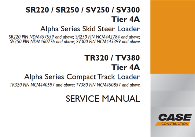 Original Factory Service Repair Manual for the Case SR220/SR250/SV250/SV300 Tier 4A Alpha Series Skid Steer Loader, TR320/TV380 Tier 4A Alpha Series Compact Track Loader.