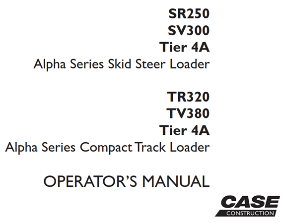 Original Factory Operator’s Manual for the Case SR250/SV300 Tier 4A Alpha Series Skid Steer Loader, TR320/TV380 Tier 4A Alpha Series Compact Track Loader.