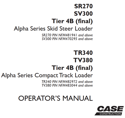 Original Factory Operator’s Manual for the Case SR270/SV300 Tier 4B (final) Alpha Series Skid Steer Loader, TR340/TV380 Tier 4B (final) Alpha Series Compact Track Loader.