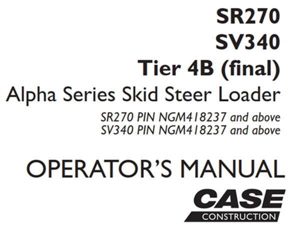 Original Factory Operator’s Manual for the Case SR270/SV340 Tier 4B (final) Alpha Series Skid Steer Loader.