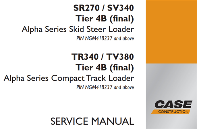 Original Factory Service Repair Manual for the Case SR270/SV340 Tier 4B (final) Alpha Series Skid Steer Loader, TR340/TV380 Tier 4B (final) Alpha Series Compact Track Loader.