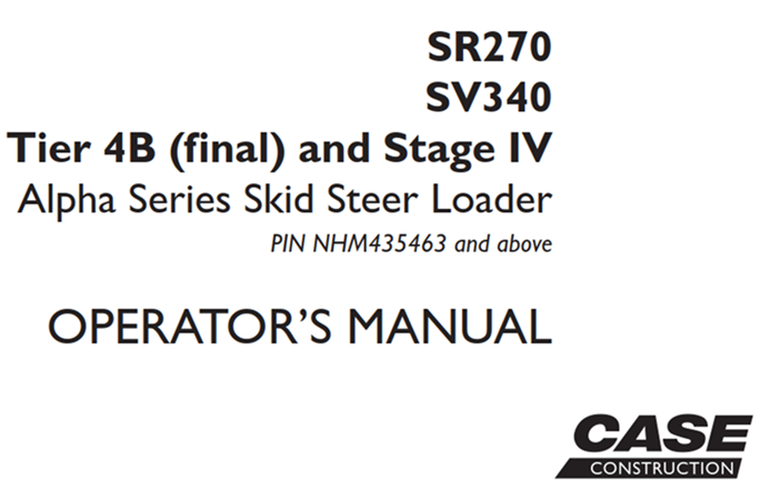 Case SR270/SV340 Tier 4B (final) and Stage IV Alpha Series Skid Steer Loader Operator’s Manual (PIN NHM435463 and above)