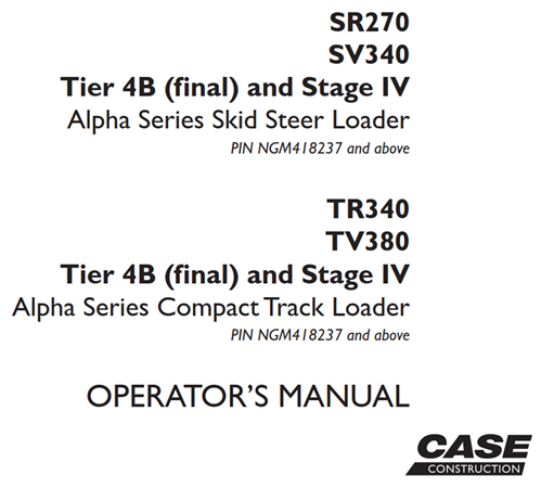 Original Factory Operator’s Manual for the Case SR270/SV340 Tier 4B (final) and Stage IV Alpha Series Skid Steer Loader, TR340/TV380 Tier 4B (final) and Stage IV Alpha Series Compact Track Loader.