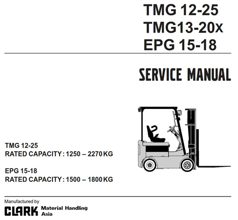 Original Factory Service Repair Manual for the Clark TMG12, TMG13, TMG15s, TMG15, TMG17, TMG18, TMG20, TMG20x, TMG25, EPG15, EPG18 Forklift Trucks.