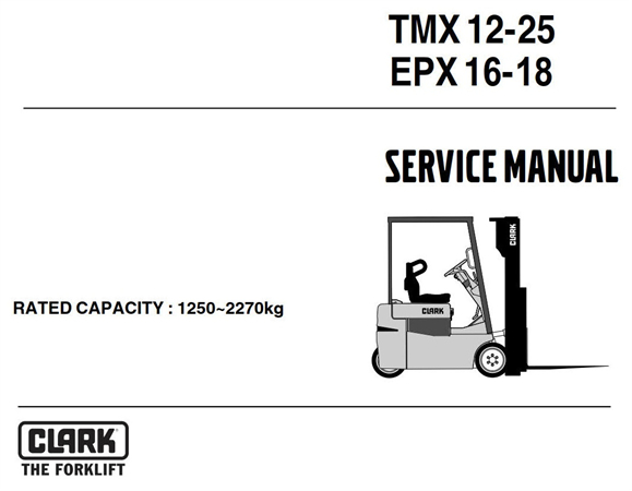 Original Factory Service Repair Manual for the Clark TMX12, TMX13, TMX15s, TMX15, TMX17, TMX18, TMX20, TMX20x, TMX25,EPX16, EPX18 Forklift Trucks.