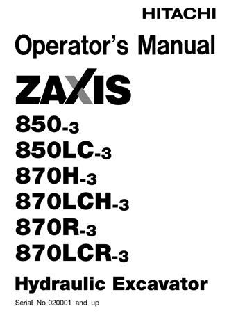 Original Factory Operator’s Manual for the Hitachi Zaxis 850-3, Zaxis 850LC-3, Zaxis 870H-3, Zaxis 870LCH-3, Zaxis 870R-3, Zaxis 870LCR-3 Hydraulic Excavator.