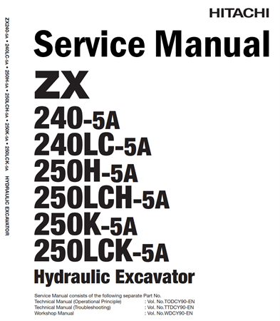 Original Factory Service Repair Manual for the Hitachi ZX240-5A, ZX240LC-5A, ZX250H-5A, ZX250LCH-5A, ZX250K-5A, ZX250LCK-5A Hydraulic Excavator.
