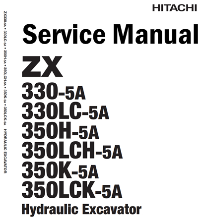 Original Factory Service Repair Manual for the Hitachi ZX330-5A, ZX330LC-5A, ZX350H-5A, ZX350LCH-5A, ZX350K-5A, ZX350LCK-5A Hydraulic Excavator.