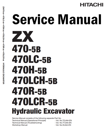 Original Factory Service Repair Manual for the Hitachi ZX470-5B, ZX470LC-5B, ZX470H-5B, ZX470LCH-5B, ZX470R-5B, ZX470LCR-5B Hydraulic Excavator.