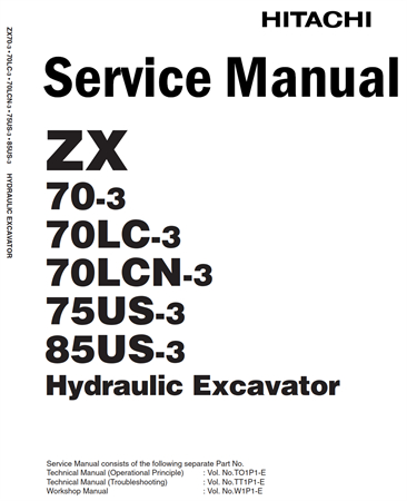 Original Factory Service Repair Manual for the Hitachi ZX70-3, ZX70LC-3, ZX70LCN-3, ZX75US-3, ZX85US-3 Hydraulic Excavator.