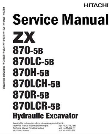 Original Factory Service Repair Manual for the Hitachi ZX870-5B, ZX870LC-5B, ZX870H-5B, ZX870LCH-5B, ZX870R-5B, ZX870LCR-5B Hydraulic Excavator.