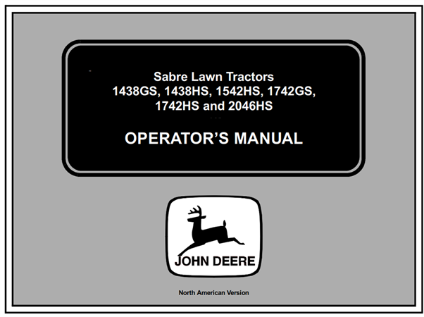 Original Factory Operator’s Manual for the John Deere 1438GS, 1438HS, 1542HS, 1742GS, 1742HS, 2046HS Sabre Lawn Tractors.
