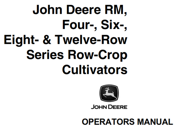 Original Factory Operator’s Manual for the John Deere RM Four-, Six-, Eight-, & Twelve-Row Series Row-Crop Cultivators.