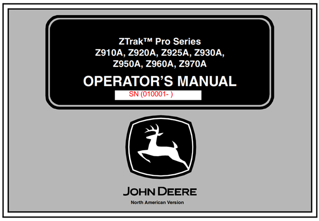Original Factory Operator’s Manual for the John Deere ZTrak Pro Series (Z910A, Z920A, Z925A, Z930A, Z950A, Z960A, Z970A).