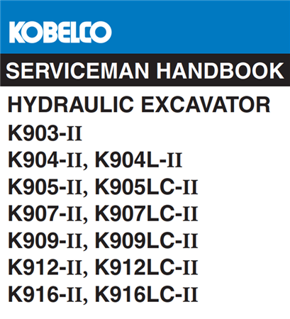 Original Factory Serviceman’s handbook for the Kobelco K903-II, K904-II, K904L-II, K905-II, K905LC-II, K907-II, K907LC-II, K909-II, K909LC-II, K912-II, K912LC-II, K916-II, K916LC-II Hydraulic Excavator.