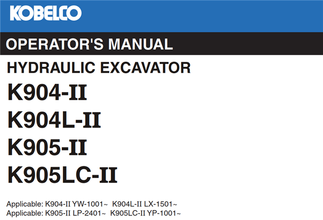 Kobelco K904-II, K904L-II, K905-II, K905LC-II Hydraulic Excavator Operator’s Manual
