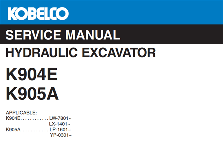 Original Factory Service Repair Manual for the Kobelco K904E, K905A Hydraulic Excavator.
