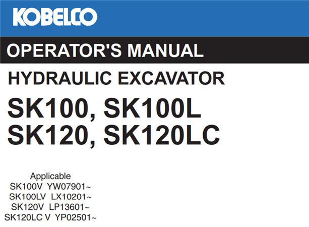 Original Factory Operator’s Manual for the Kobelco SK100, SK100L, SK120, SK120LC Super Mark V Hydraulic Excavator.
