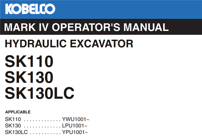 Kobelco SK110 / SK130 / SK130LC MARK IV Hydraulic Excavator Operator’s Manual