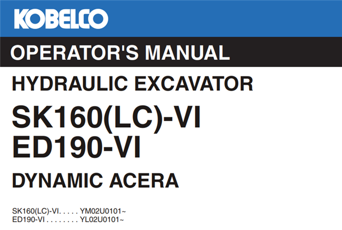 Original Factory Operator’s Manual for the Kobelco SK160(LC)-VI, ED190-VI Dynamic Acera Hydraulic Excavator.