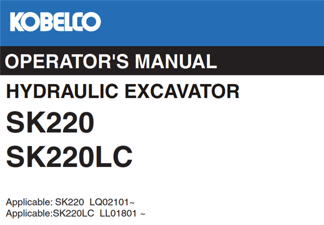 Original Factory Operator’s Manual for the Kobelco SK220, SK220LC Hydraulic Excavator.