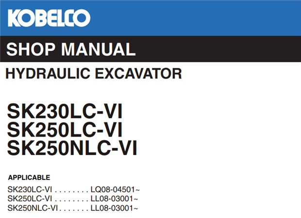 Original Factory Service Repair Manual for the Kobelco SK230LC-VI, SK250LC-VI, SK250NLC-VI Hydraulic Excavator.