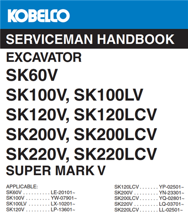 Original Factory Serviceman’s handbook for the Kobelco SK60V, SK100V, SK100LV, SK120V, SK120LCV, SK200V, SK200LCV, SK220V, SK220LCV Super Mark V Excavator.