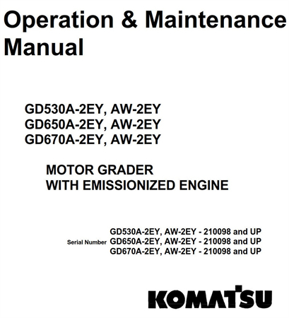 Original Factory Operation & Maintenance Manual for the Komatsu GD530A-2EY, GD530AW-2EY, GD650A-2EY, GD650AW-2EY, GD670A-2EY, GD670AW-2EY Motor Grader With Emissionized Engine.