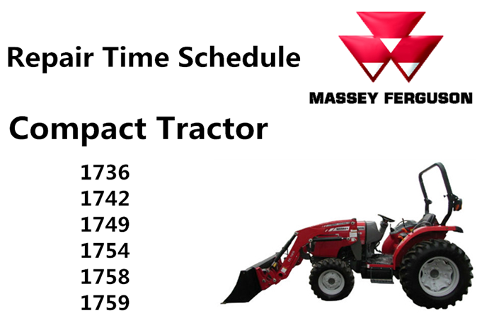 Original Factory Repair Time Schedule Manual for the Massey Ferguson 1736/1742/1749/1754/1758/1759 Compact Tractor.