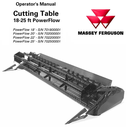 Original Factory Operator’s Manual for the Massey Ferguson 18-25 ft PowerFlow Cutting Table.