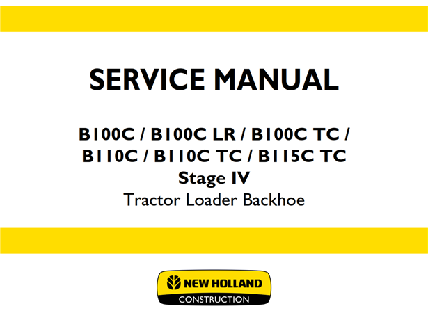 Original Factory Service Repair Manual for the New Holland B100C / B100C LR / B100C TC / B110C / B110C TC / B115C TC Stage IV Tractor Loader Backhoe.