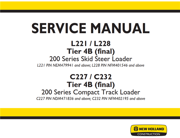 Original Factory Service Repair Manual for the New Holland L221 / L228 Tier 4B (final) Skid Steer Loader, C227 / C232 Tier 4B (final) Compact Track Loader.