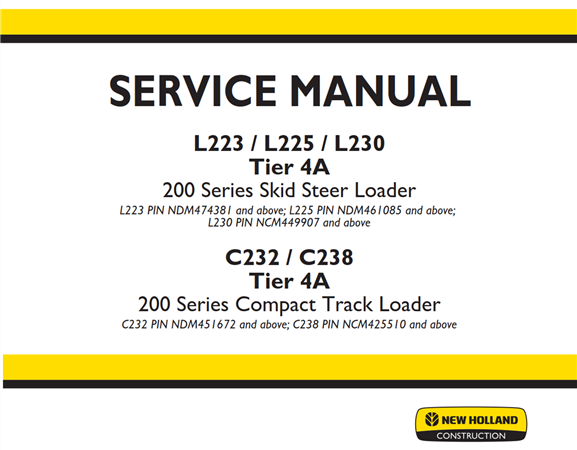 Original Factory Service Repair Manual for the New Holland L223 / L225 / L230 Tier 4A Skid Steer Loader, C232 / C238 Tier 4A Compact Track Loader.