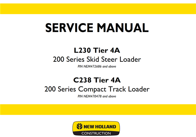 Original Factory Service Repair Manual for the New Holland L230 Tier 4A Skid Steer Loader, C238 Tier 4A Compact Track Loader.