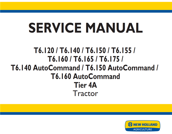 Original Factory Service Repair Manual for the New Holland T6.120 / T6.140 / T6.150 / T6.155 / T6.160 / T6.165 / T6.175 / T6.140 AutoCommand / T6.150 AutoCommand / T6.160 AutoCommand Tier 4A Tractor.