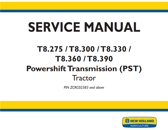 Original Factory Service Repair Manual for the New Holland T8.275 / T8.300 / T8.330 / T8.360 / T8.390 Powershift Transmission (PST) Tractor.