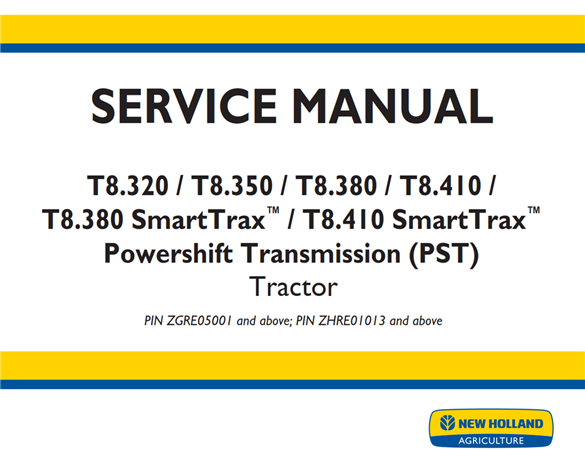 Original Factory Service Repair Manual for the New Holland T8.320 / T8.350 / T8.380 / T8.410 / T8.380 SmartTrax / T8.410 SmartTrax Powershift Transmission (PST) Tractor.